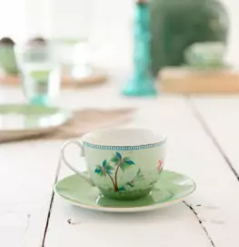 - Desenhada com as mais finas estampas, cores vivas e com os olhos voltados para os detalhes. Com a sua estampa floral e com um delicado toque dourado e o seu pires tem um formato especial que dá um toque de simplicidade para a peça;
